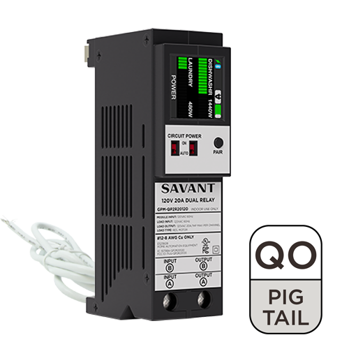 Savant’s Dual 20A Power Module (120V AC with Current Transformer – QO™ compatible with pigtail neutral) controls and monitors up to two 20 amp circuits; ideal for outlets, kitchen appliances, lighting, and more.